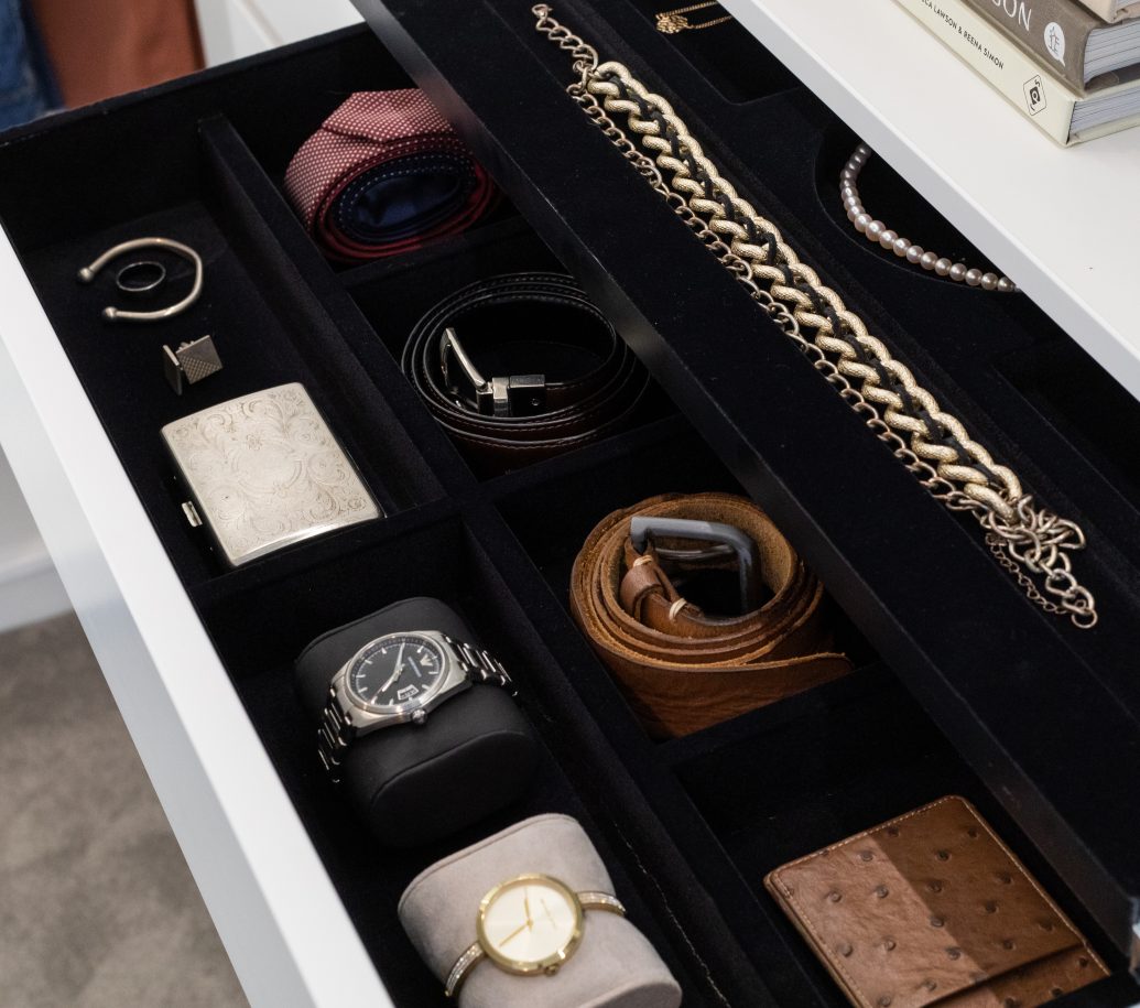 Jewellery and other custom storage: We have beautifully flocked drawers available in a range of styles including concealed drawers for additional security. A luxurious extra for your special accessories – sunglasses, belts, ties, scarves, jewellery – and other precious or favourite designer pieces.